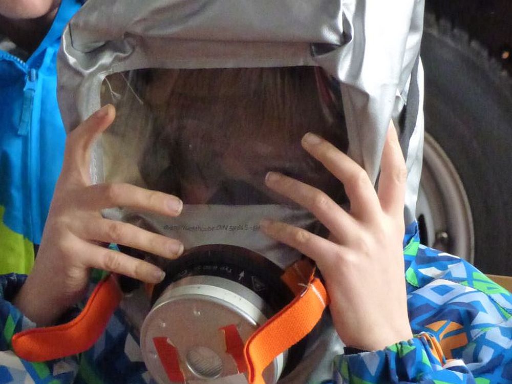 Dies ist für uns sehr wichtig, damit die Kinder sehen wie ein Feuerwehrmann mit Atemschutz aussieht, sich beim Sprechen anhört und man ihn atmen hört.