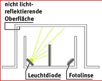 Foto-optische Rauchmelder arbeiten nach dem sog. Streulichtprinzip. D.h., im Inneren der Geräte befindet sich eine Rauchkammer, in der von einer Leuchtdiode regelmäßig Lichtstrahlen ausgesendet werden. Ist die Kammer rauchfrei, so treffen diese nicht auf die Fotolinse, da die Oberfläche der Rauchkammer kein Licht reflektiert.