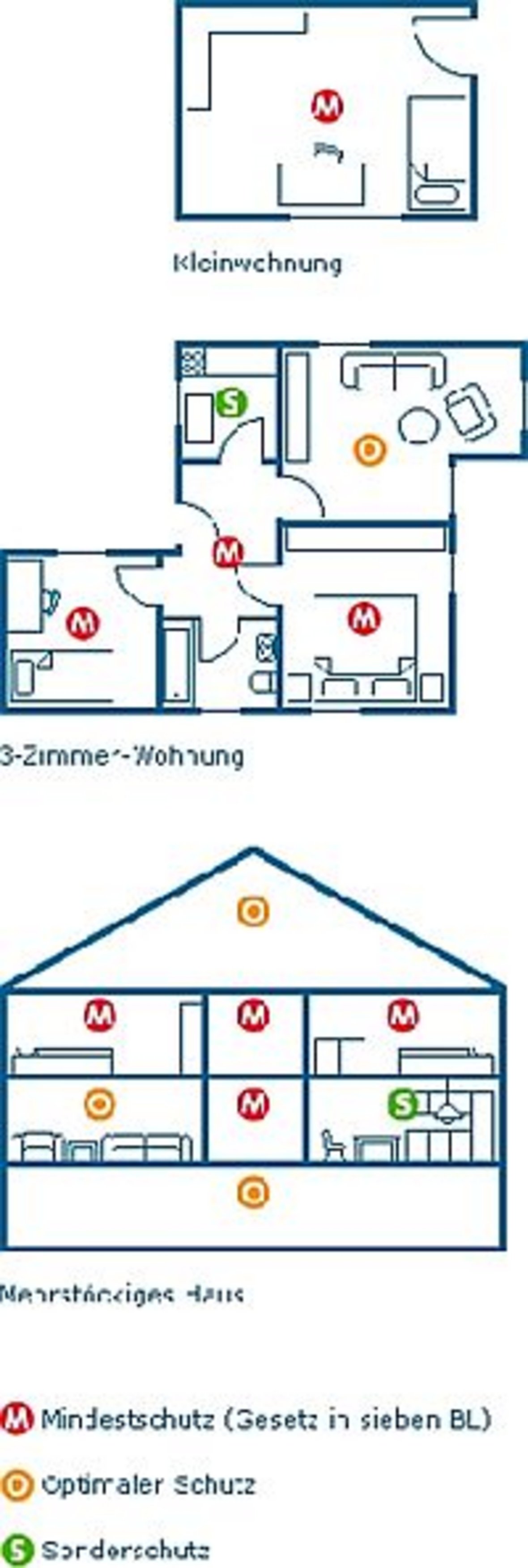 Ein Rauchmelder pro Wohnung als Mindestschutz zwischen Wohn- und Schlafbereich. Besser: Rauchmelder vor jedem Schlafbereich und in den Schlaf- und Kinderzimmern.