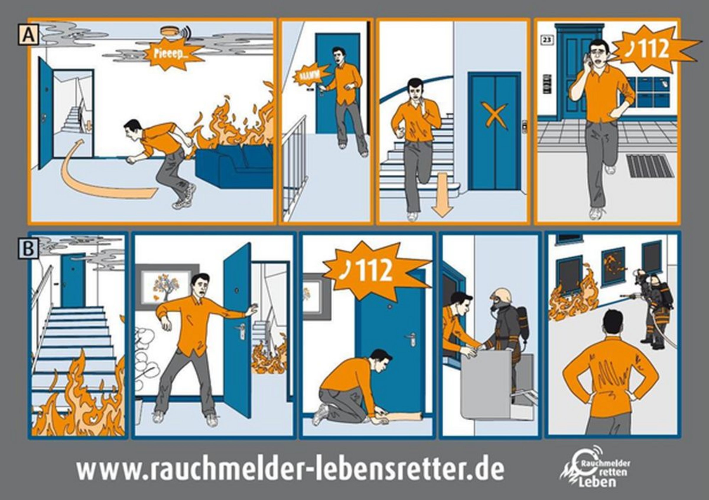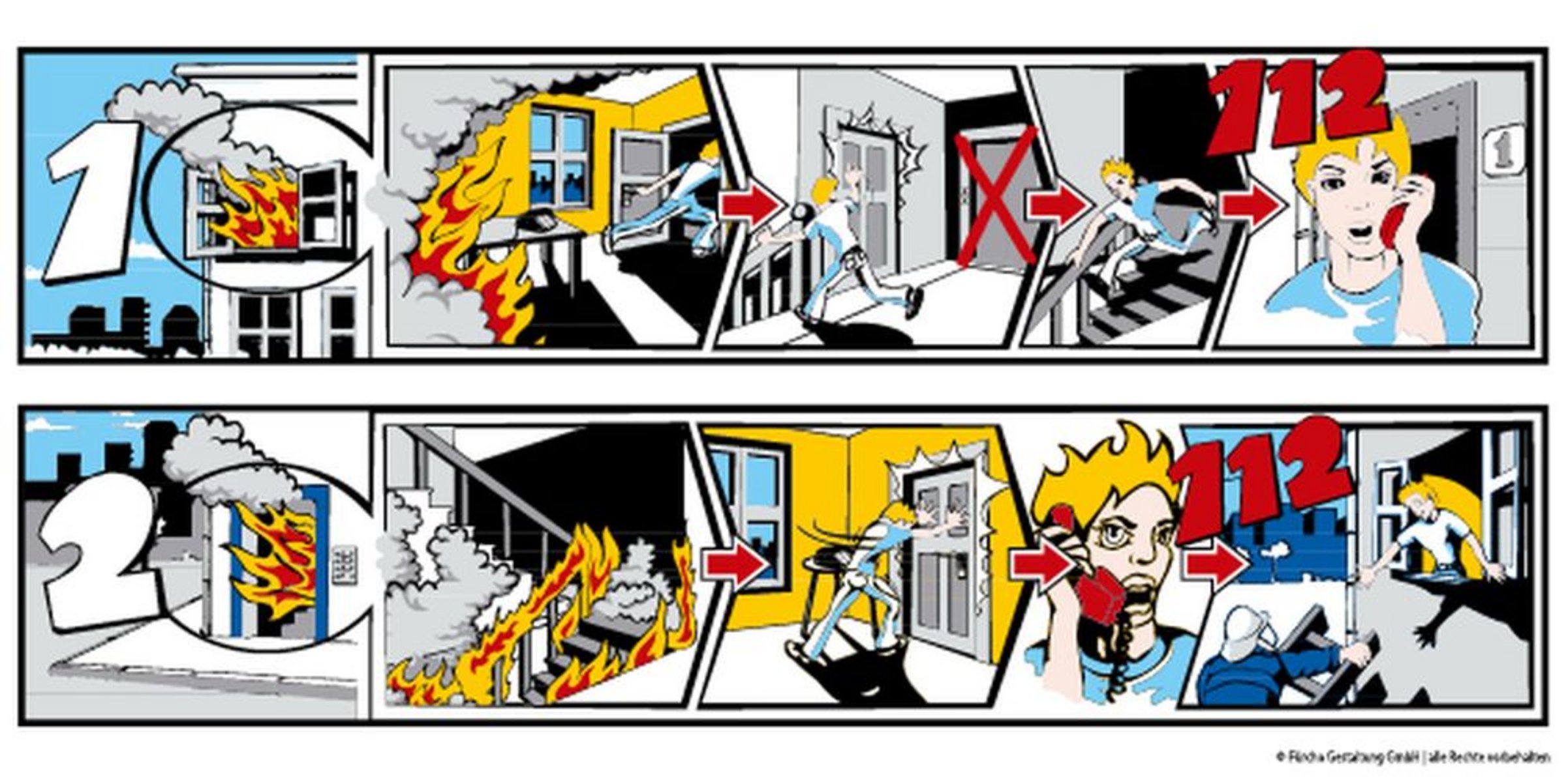 Für das richtige Verhalten im Brandfall gibt es auch zwei Comics in unterschiedlichen Stilen. Diese sollen unabhängig von möglichen Sprachbarrieren dieses Wissen vermitteln. Die Aussagen der beiden ist identisch.